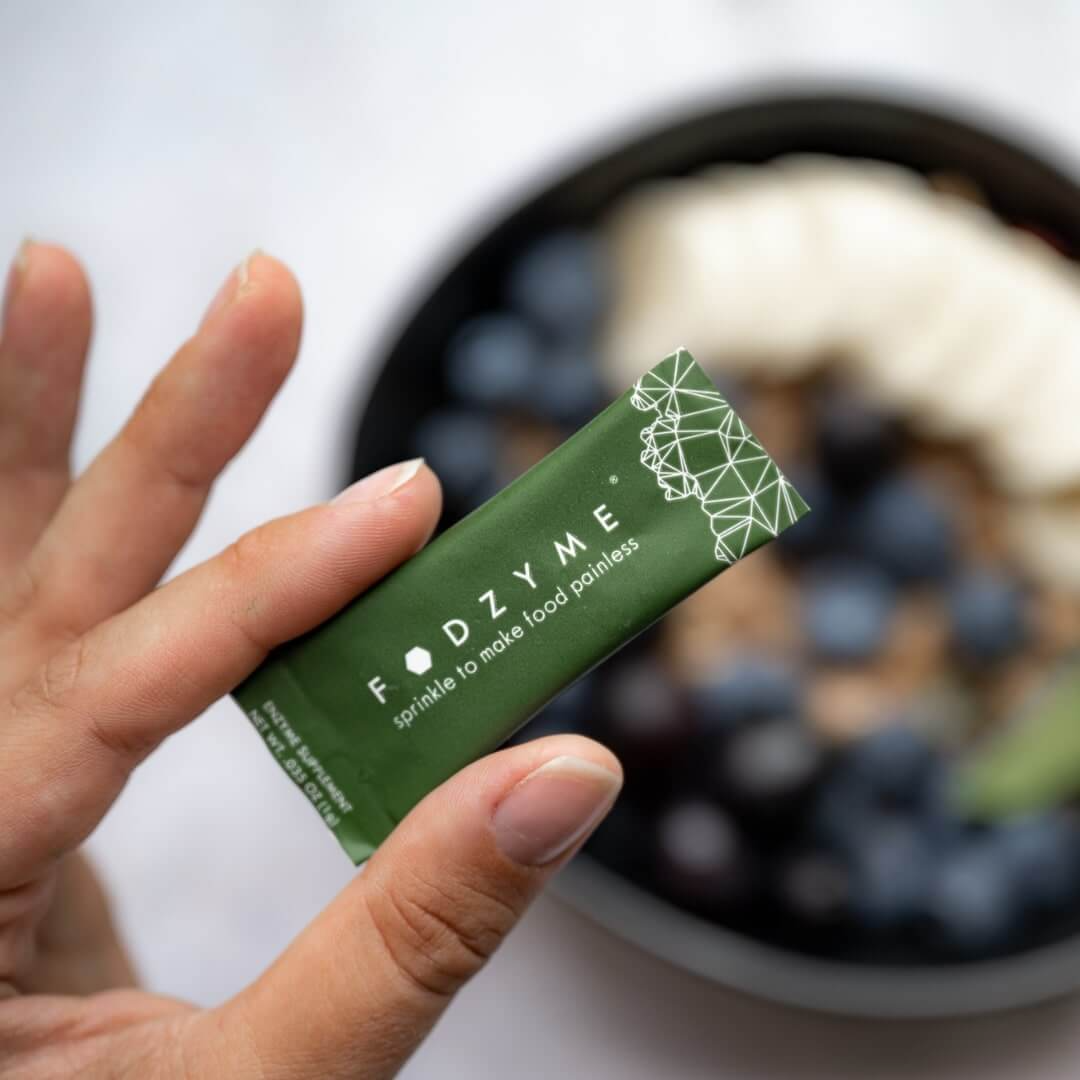 FODZYME®is a tasteless enzyme powder designed to break down FODMAPs (fructan, GOS, and lactose) in food to make meals more digestible. It's formulated specifically for people with FODMAP sensitivities.