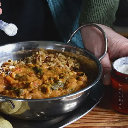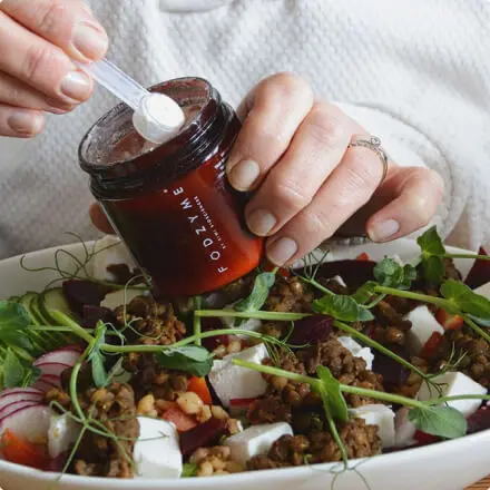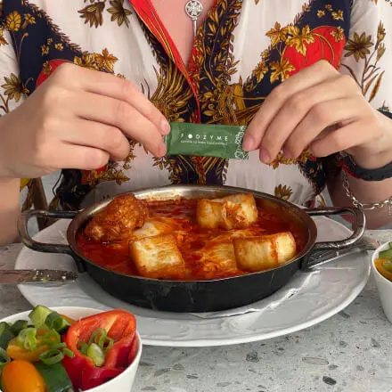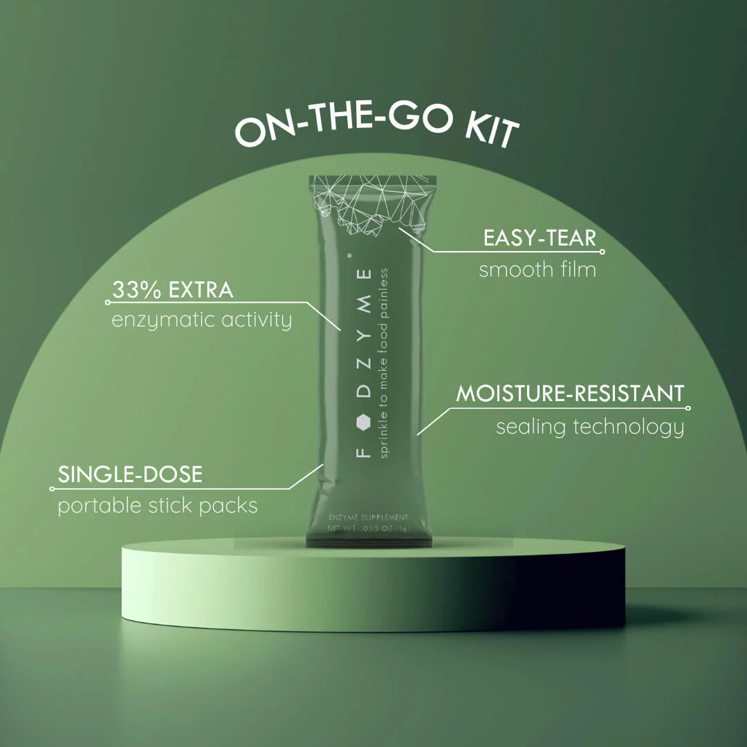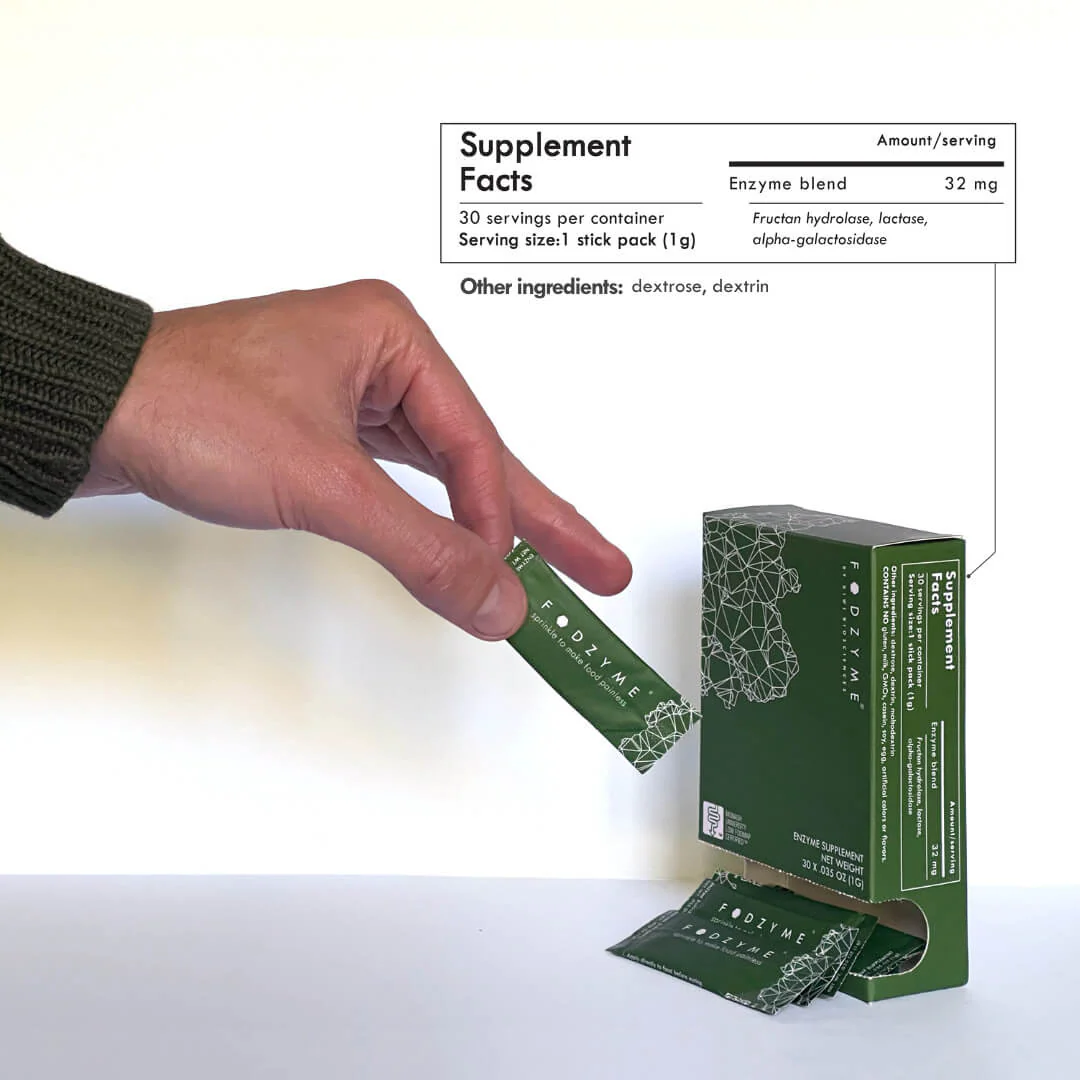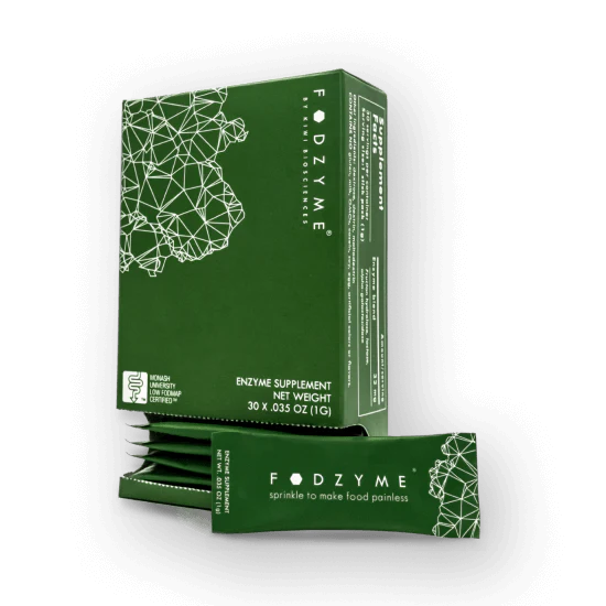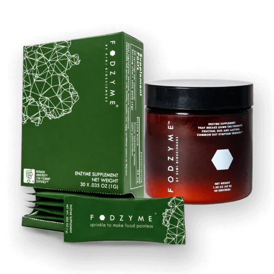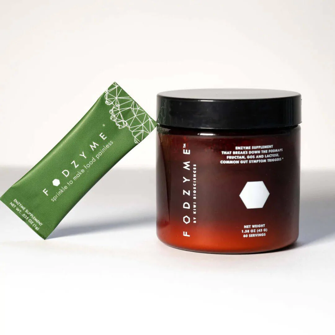 FODZYME®is a tasteless enzyme powder designed to break down FODMAPs (fructan, GOS, and lactose) in food to make meals more digestible. It's formulated specifically for people with FODMAP sensitivities.