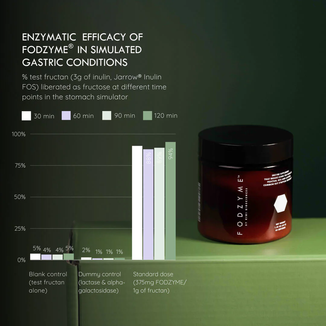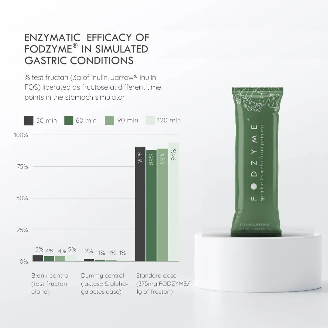FODZYME® begins breaking down FODMAPs immediately upon contact with food. In simulated gastric conditions, it degraded up to 90% of FODMAPs like fructans within 30 minutes. This rapid action prevents undigested FODMAPs from reaching the colon, where they typically ferment and cause symptoms such as bloating and gas.