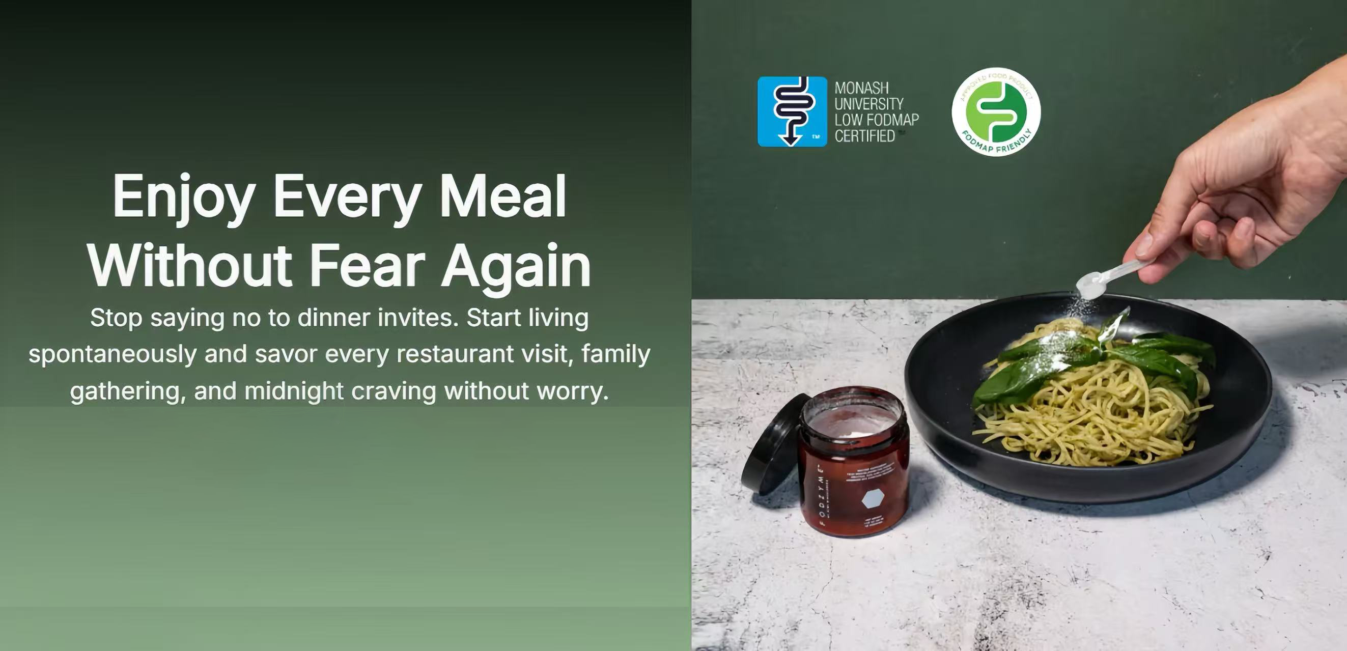 Offered in a powdered form for immediate action, FODZYME® mixes instantly with your food—cutting down FODMAP content by up to 90% and easing symptoms like bloating and gas. It’s Monash University-certified and backed by clinical trials, making it a science-driven solution for those seeking real dietary freedom.