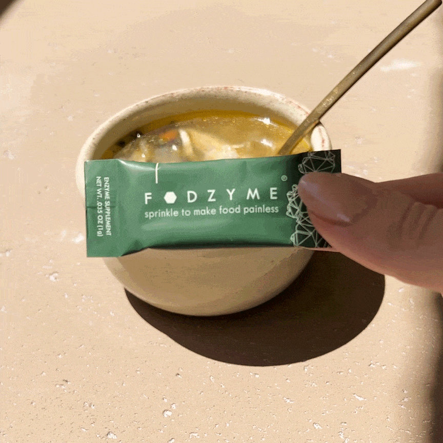 FODZYME®is a tasteless enzyme powder designed to break down FODMAPs (fructan, GOS, and lactose) in food to make meals more digestible. It's formulated specifically for people with FODMAP sensitivities.